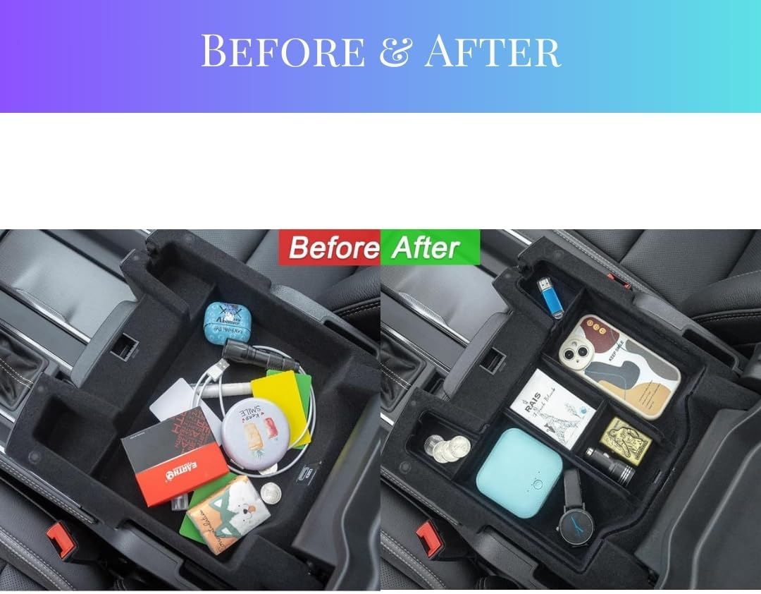 - 🔧 – 【Function】If you often cannot find the small items in the car, you must need this organizer. Provide space to put your key, cell phone, charging adapters, credit card, ID Badges, and coins, etc. Provides you with quick access to commonly used items with more storage space than OEM tray.