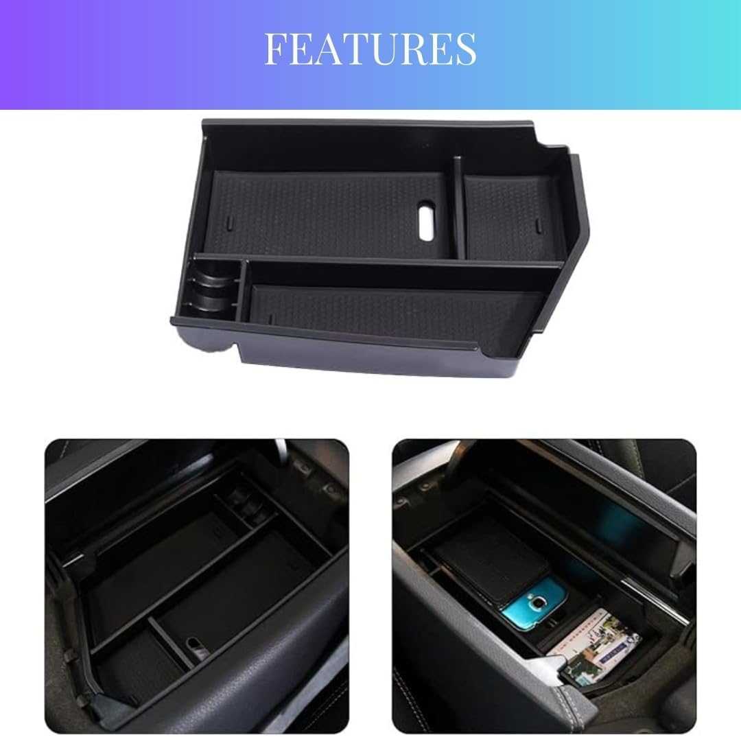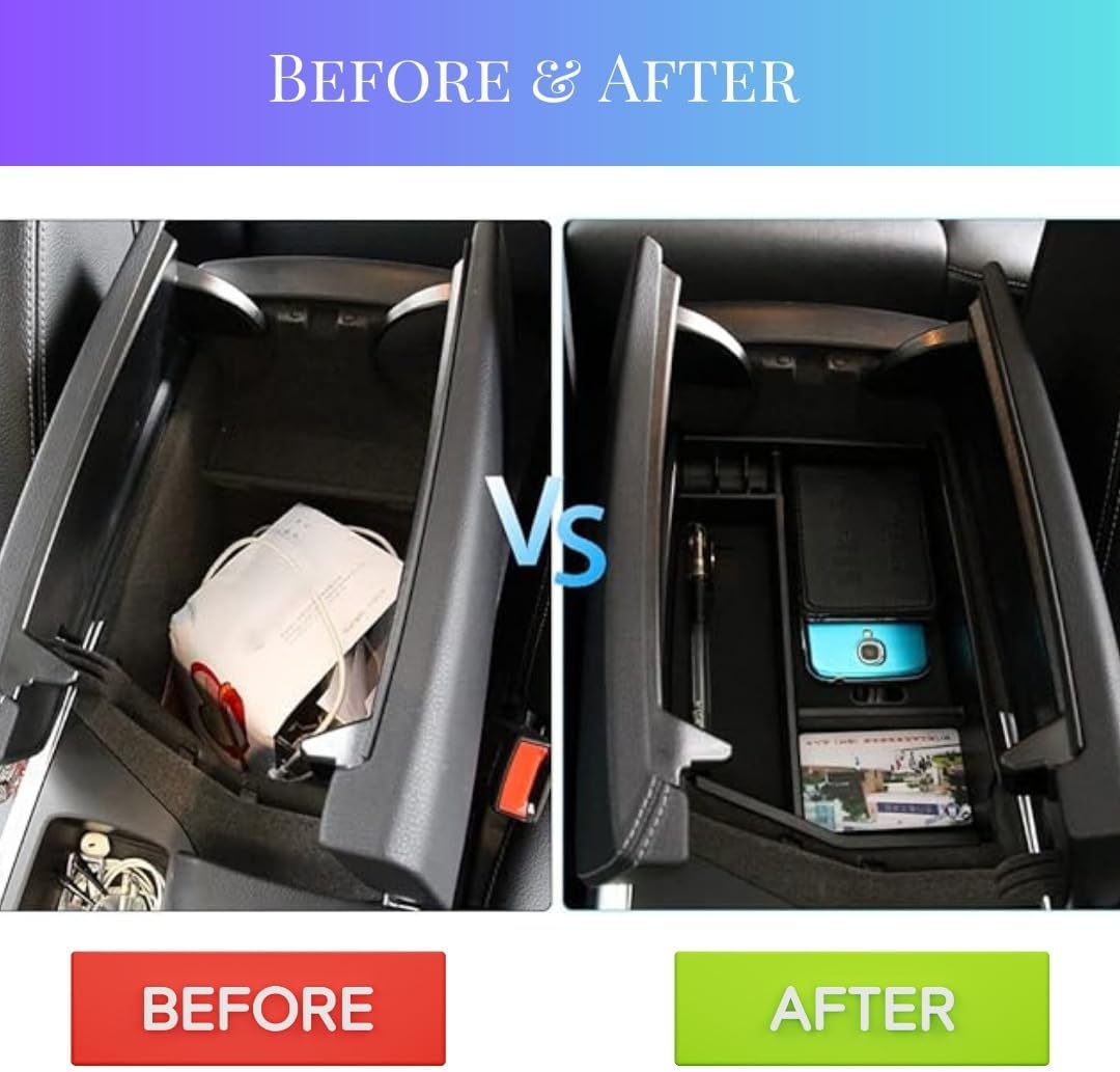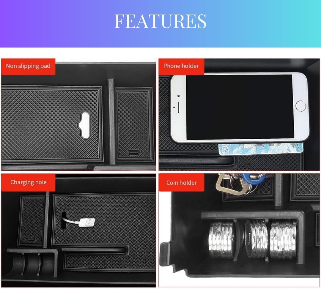 - 🔧 – 【Function】If you often cannot find the small items in the car, you must need this organizer. Provide space to put your key, cell phone, charging adapters, credit card, ID Badges, and coins, etc. Provides you with quick access to commonly used items with more storage space than OEM tray.