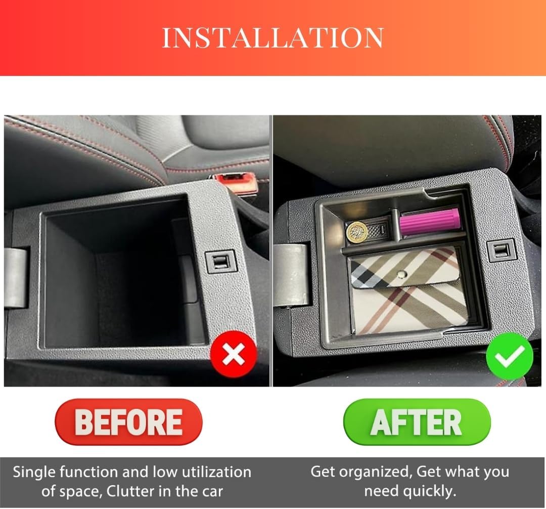 - 🔧 – 【Function】If you often cannot find the small items in the car, you must need this organizer. Provide space to put your key, cell phone, charging adapters, credit card, ID Badges, and coins, etc. Provides you with quick access to commonly used items with more storage space than OEM tray.