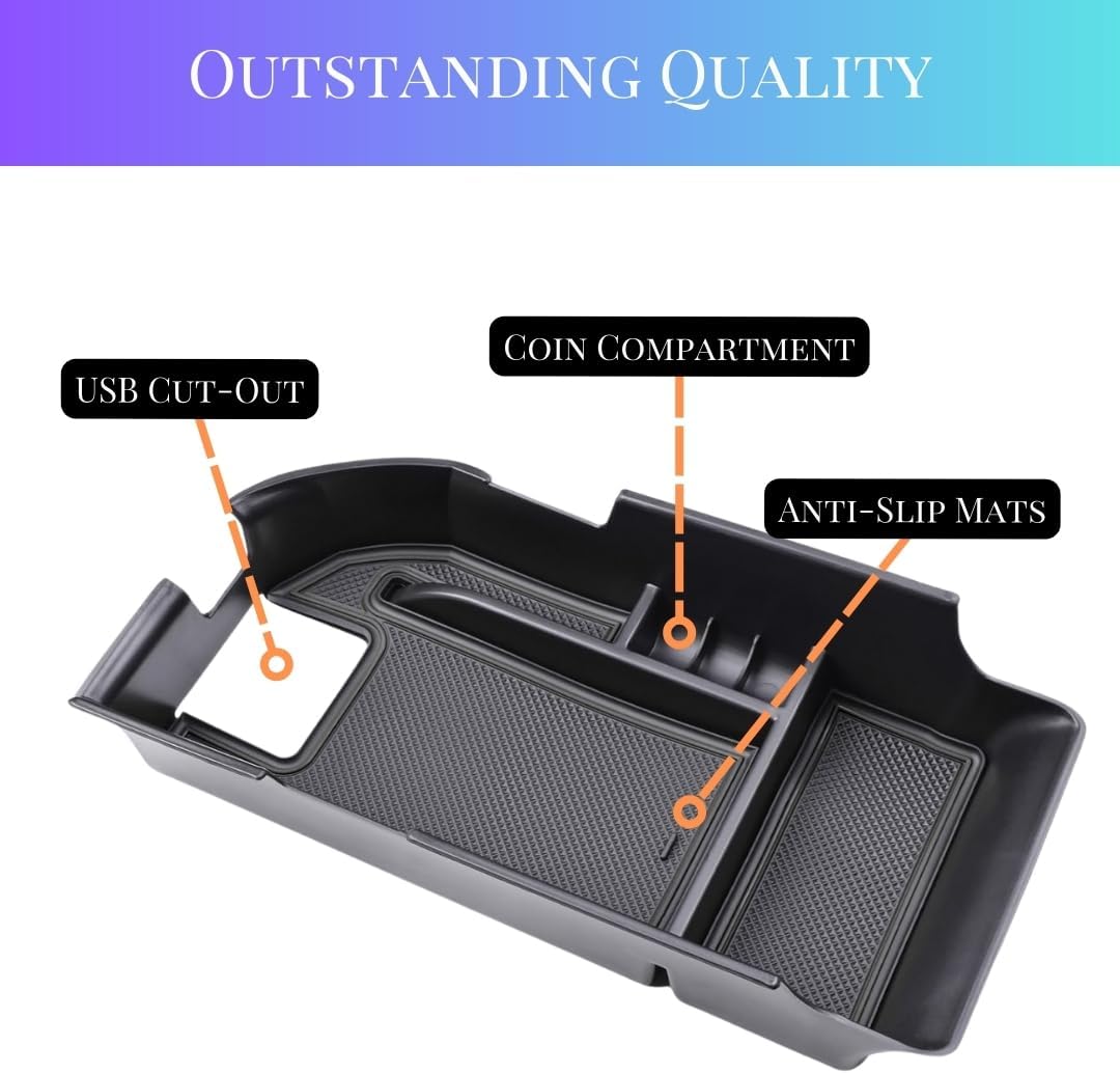 - 🔧 – 【Function】If you often cannot find the small items in the car, you must need this organizer. Provide space to put your key, cell phone, charging adapters, credit card, ID Badges, and coins, etc. Provides you with quick access to commonly used items with more storage space than OEM tray.